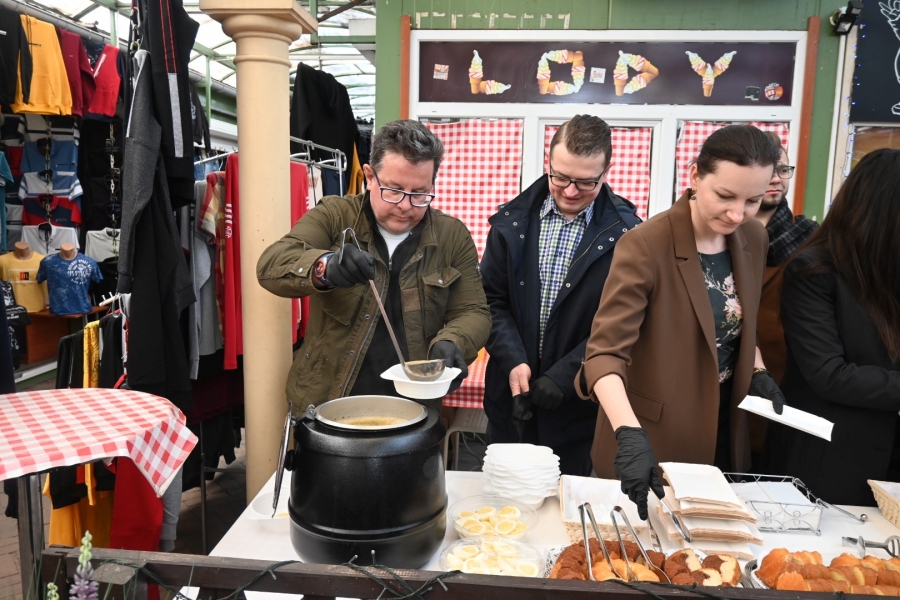 Wśród świątecznych dań nie zabrakło żurka z jajkiem, sałatki jarzynowej, sałatki wielkanocnej oraz typowych ciast wielkanocnych. Poczęstunek, jak co roku, cieszył się dużym zainteresowaniem łodzianek i łodzian, dokonujących ostatnich przedświątecznych zakupów.